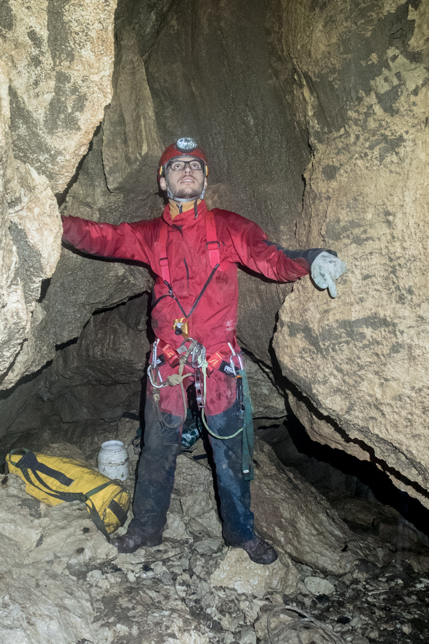 Una squadra composta da Orlando Lacarbonara, Donatella Leserri e Angelo Semeraro si è quindi recata in grotta per osservare e individuare potenziali possibilità esplorative. Poco dopo sono stati raggiunti da Michele Marraffa, Pasquale e Gianluca Calella e sono state individuate tre comode risalite e un cunicolo sul fondo con passaggio di aria. Si è scelto di risalire nel punto più asciutto, rimandando le altre al periodo estivo. La risalita, una decina di metri circa lasciava intravedere una prosecuzione in orizzontale. In realtà, superato il terrazzino e dopo un breve passaggio intorno a una lama di roccia si continua a risalire per pochi metri ancora fino raggiungere una piccola condotta forzata, parzialmente ostruita, che lascia ben poche possibilità esplorative. Sette metri più in alto rispetto alla cengia si intravede un altro passaggio la cui base è caratterizzata da enormi blocchi di frana. Considerati i pochi metri che ci separano dalla quota d’ingresso (30), abbiamo deciso di non proseguire la risalita perché è vanificata la possibilità di bypassare il fondo.