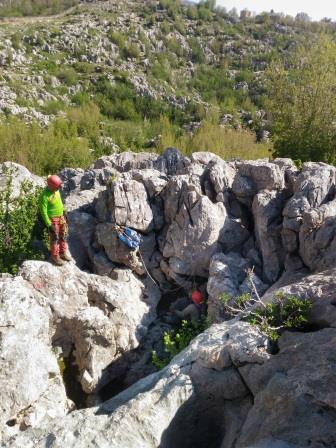 Finalmente siamo sul Vrime i Ex, una cavità sul versante nord, che – ci racconta George – è stata esplorata, una decina ma forse anche venti anni prima da un coppia francese, marito e moglie che si calarono nel pozzo uscendone tre ore più tardi.